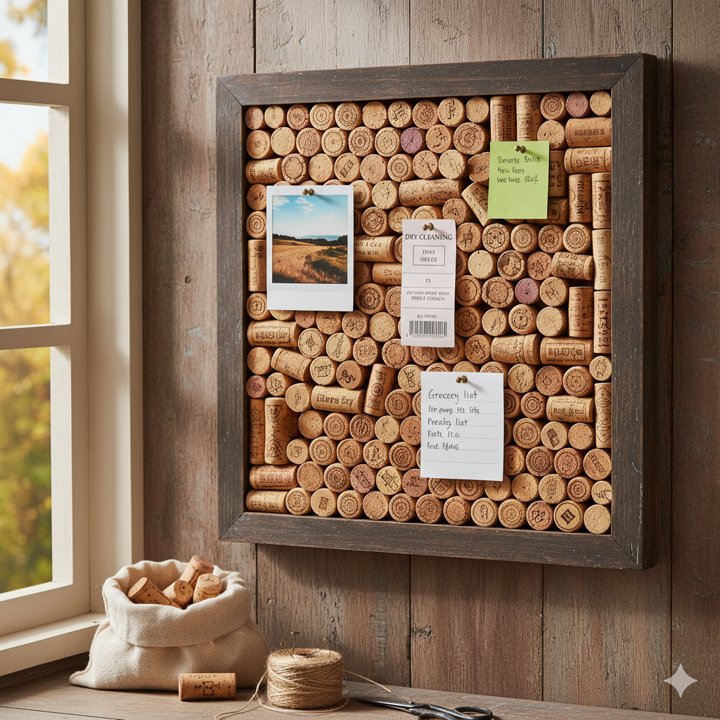 Seu quadro de rolhas recicladas pode ser um grande aliado na organização de qualquer ambiente. Na cozinha, pode ser usado para fixar receitas e listas de compras. No escritório, para lembretes importantes. E na sala, como uma peça de arte funcional para expor fotos, postais e pequenas decorações.